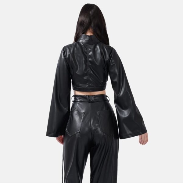 Cropped black vegan leather jacket with a high neckline, gold buttons, and wide sleeves. Lined with soft cotton and made from mid-weight vegan leather. Australian-made and suitable for transitional seasons.