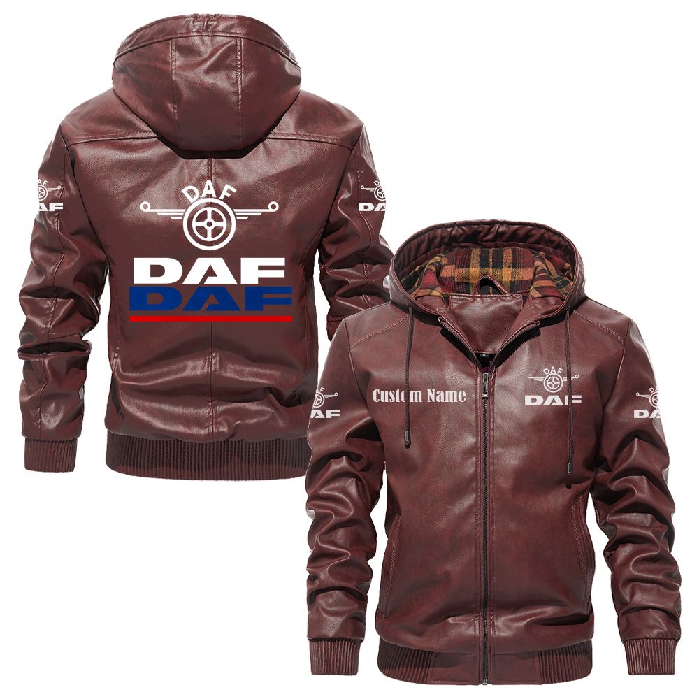 Custom Name Daf PU Leather Hooded Jacket – Personalized Logo Car Motorcycle Model