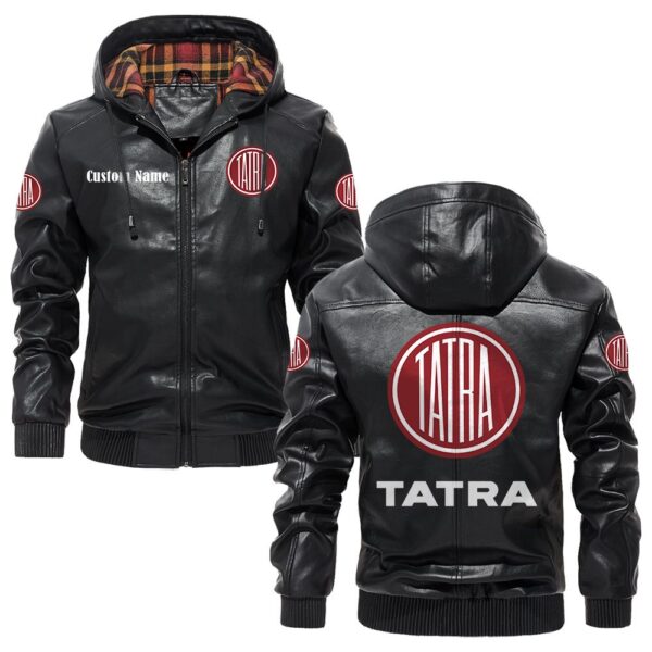 Custom Name Tatra PU Leather Hooded Jacket – Personalized Logo Car Motorcycle Model
